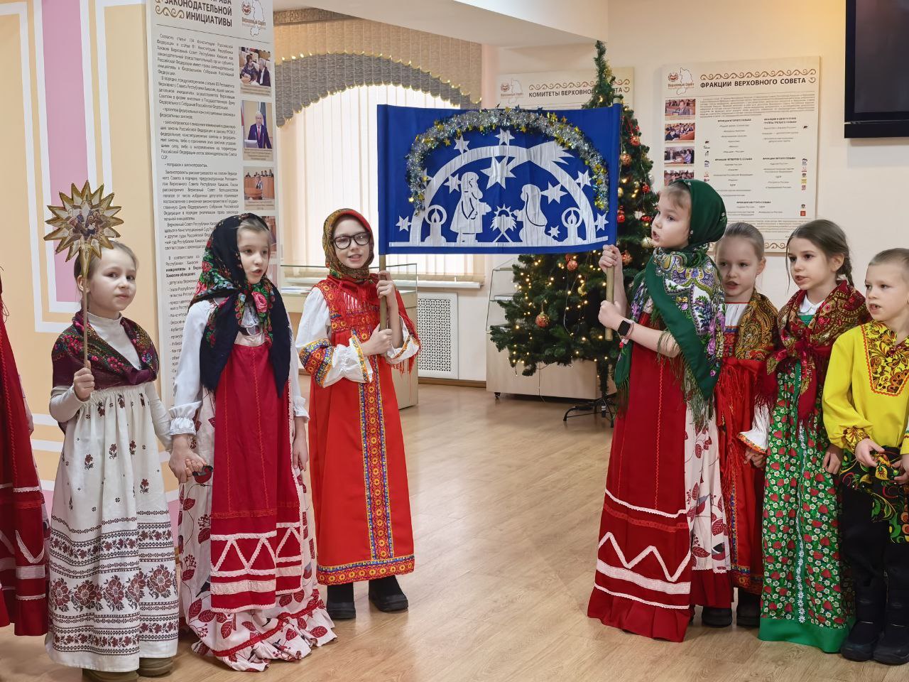 Вместе со своим руководителем Ольгой Мацаевой – регентом хора храма Святителей Московских города Абакана, членом Союза композиторов Республики Хакасия, дети в традиционной для колядок одежде, исполнили Рождественские тематические песни.